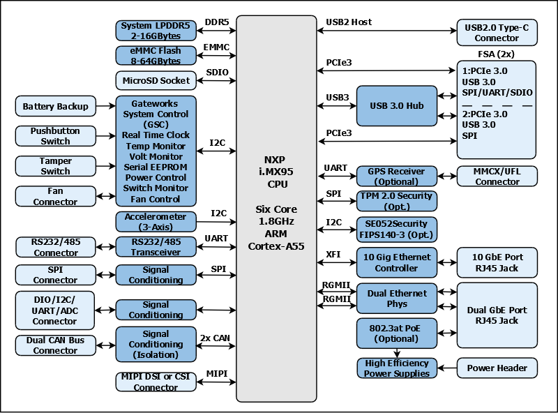 - 64-bit 1.8GHz NXP™ i.MX95 Six Core ARM® Cortex™ A55 SoC processor