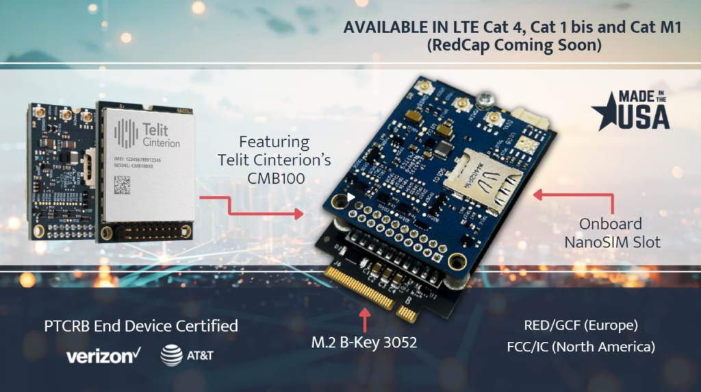 Built in the USA and powered by Telit Cinterion’s CMB100 module, the GW16162 supports LTE CAT-4, CAT-M1/NB2, CAT-1 BIS, and is future-ready for 5G RedCap. Its M.2 B-Key form factor integrates seamlessly with Gateworks SBCs featuring NXP’s i.MX processors to provide a streamlined path to wireless connectivity in embedded and industrial environments.